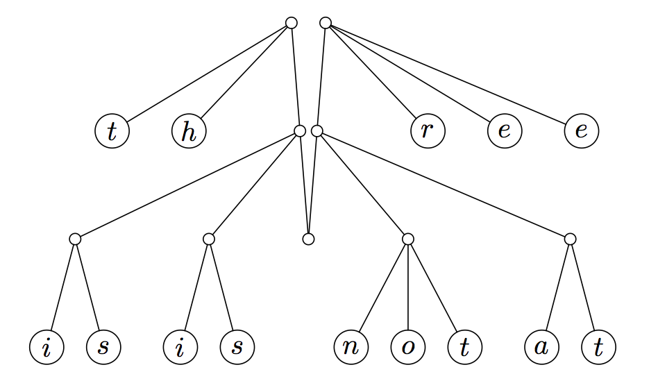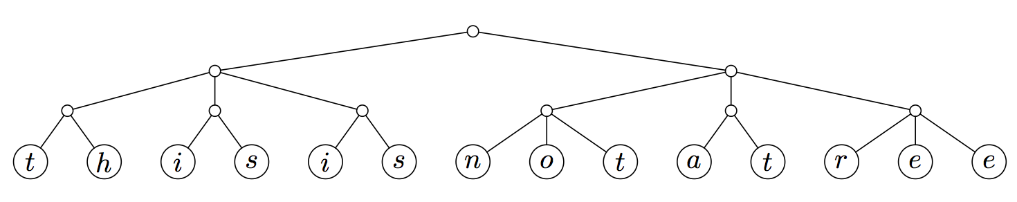 示例中的数字是带有字母的节点。每个列表由树脊上每个节点的前缀或后缀划分。在转换后的 2-3 树中,顶层的数字列表似乎可以有两个或三个长度,而较低级别的长度只有一或两个。为了使手指树的某些应用程序能够如此高效地运行,手指树允许在每个级别上有 \(1\) 到 \(4\) 个子树。手指树的数字可以转换成一个列表,如: